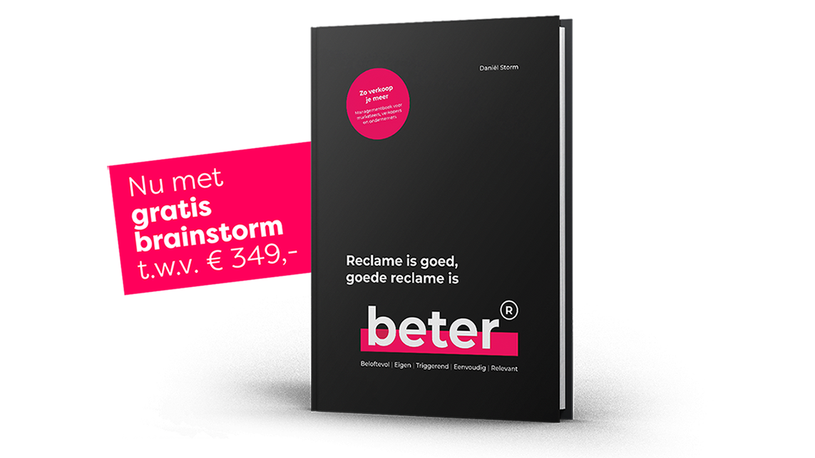 Reclame is goed, goede reclame is BETER. Dat is de marketingtheorie van Daniël Storm van Team Switch. Je raadt het al, die letters betekenen iets. De B, E, T, E, en R staan voor Beloftevol-Eigen-Triggerend-Eenvoudig-Relevant. Elk een begrip dat onmisbaar is bij het maken van reclame die impact maakt. En als je al deze begrippen gebruikt, weet je zeker dat je de concurrent altijd een stap voor bent. Wil jij ook alles weten over de BETER-theorie en nooit meer een slechte advertentie, social post, website of andere reclame-uiting maken? Bestel het boek dan direct!