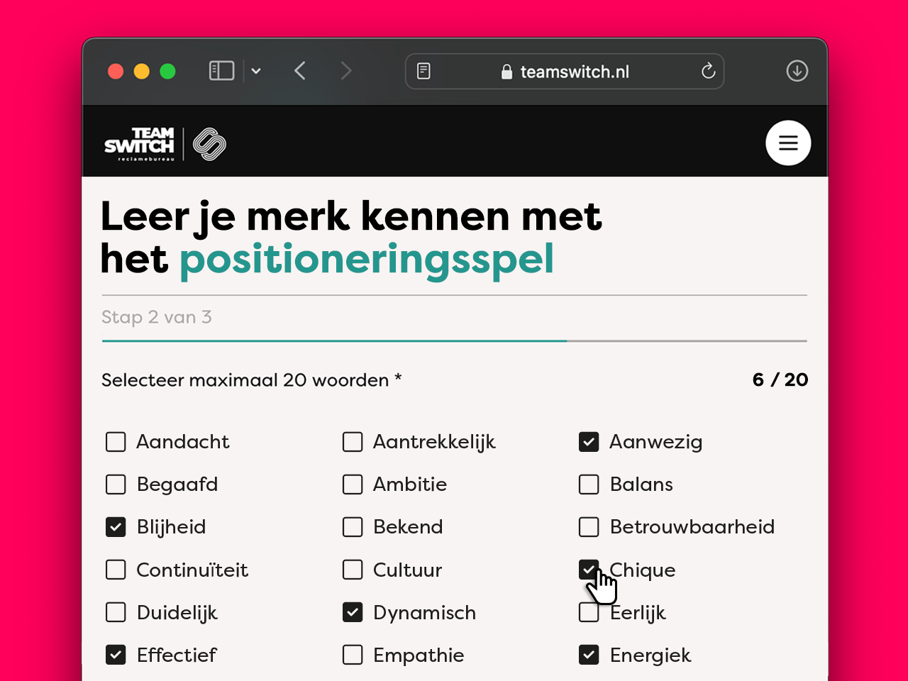 Impactvolle reclame maken wordt makkelijker als je weet wie je merk is. Het kan zijn dat je dit goed weet, of denkt te weten. Maar het kan ook zijn dat jouw merk niet de gewenste impact maakt om de de markt veranderd is. Of omdat jij veranderd bent, of je doelgroep. Met het positioneringsspel kun je op een eenvoudige, leuk manier (her)ontdekken waar jouw merk voor staat. En dat leert je ook meteen meer over wat je onderscheidt van de concurrent! Scroll naar beneden om het spel te spelen, of neem direct contact met ons op voor advies en inspiratie!