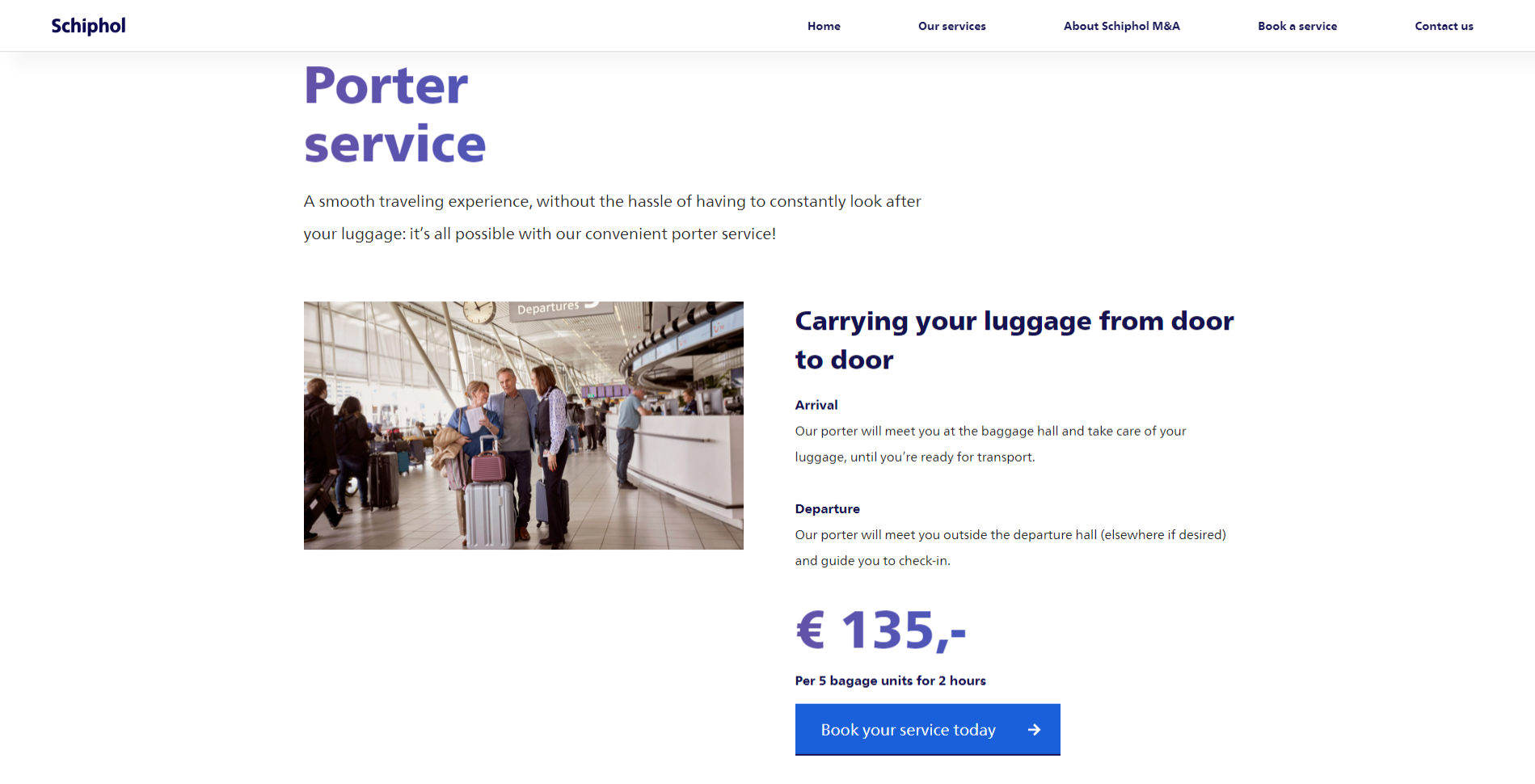 Op de site van Schiphol Meet and Assist kun je exclusieve porter-, hosting- en ontvangstservices boeken, voor als je het fijn vindt om ondersteuning te krijgen bij bijvoorbeeld inchecken of het dragen van bagage. Hier kunnen veel keuzes bij gemaakt worden voor een gepersonaliseerde behandeling. Om het voor bezoekers zo makkelijk mogelijk te maken de service te boeken, ontwikkelden wij een boekingsformulier waarin je aan de hand van een aantal vragen en keuzes op een makkelijke manier een pakket samenstelt. Terwijl je deze keuzes maakt, zie je als bezoeker direct welke invloed dit heeft op de prijs die je betaalt voor de service die je ontvangt.