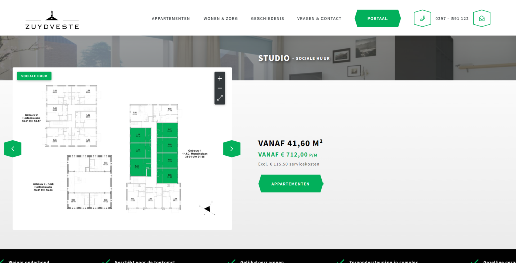 Het onlangs opgeleverde Zuydveste in Aalsmeer is een prachtig appartementencomplex voor senioren in en rond de voormalige Zuiderkerk. Op de website van Zuydveste konden gegadigden zich inschrijven voor verschillende soorten appartementen. Los van de sfeerimpressies vonden wij het ook belangrijk dat geïnteresseerden de kans kregen om de plattegrond van het appartement nauwkeurig te bekijken. En dat wilden we makkelijk maken! Dus, dachten we: geen gedoe met downloads, PDF’s of een korrelige afbeelding! In plaats daarvan plaatsten we een hi-res versie van de plattegrond tussen de galerij met afbeeldingen, die je naar wens in- en uit kunt zoomen. Zo kun je, als je door de afbeeldingen van het appartement heen bladert, meteen een duidelijke blik werpen op de plattegrond, zonder gedoe!