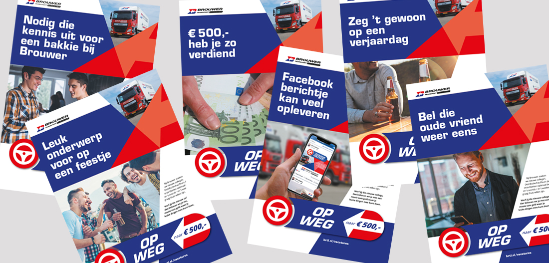 In een herkenbare Brouwer Transport-stijl bedachten we het thema ‘OP WEG naar €500,-’, ontwikkelden we een logo, mailing, een pakkende stuurhanger voor in elke vrachtwagencabine, we deelden de spelregels, hingen posters door het hele pand en deden meer. Bekijk nu alle uitingen die Team Switch heeft gecreëerd.