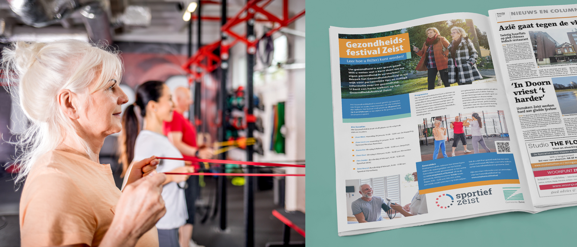 “Leer hoe u fit(ter) kunt worden”. Met die boodschap als basisbeginsel overtuigen we senioren om langs te komen op één van de Gezondheidsfestivals in Gemeente Zeist. De flyer bevat een duidelijk overzicht van de verschillende data en locaties, alsmede de activiteiten en hoe je je aan kunt melden. Ook vallen er prijzen te winnen voor senioren die zich online aanmelden. Een extra beetje motivatie, dus!