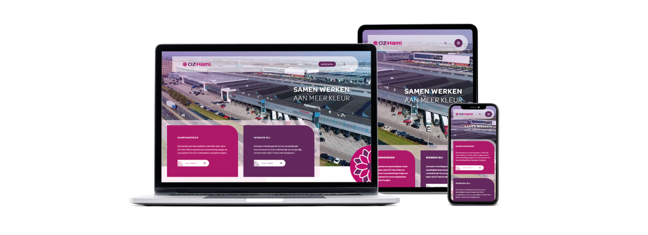 Het symmetrische, zachtpaarse logo van OZ-Hami doet denken aan een mandala. De kleuren en vormen zijn zó tekenend dat ze automatisch synoniem zijn met het bedrijf. Daarom hebben we er voor gekozen de kleuren en ook de vormen van het logo op verschillende plekken terug te laten komen in het ontwerp van de site. En omdat de bloemenindustrie nu eenmaal een kleurige bedoeling is, is er ook een hoofdrol weggelegd voor grote, opvallende beelden.