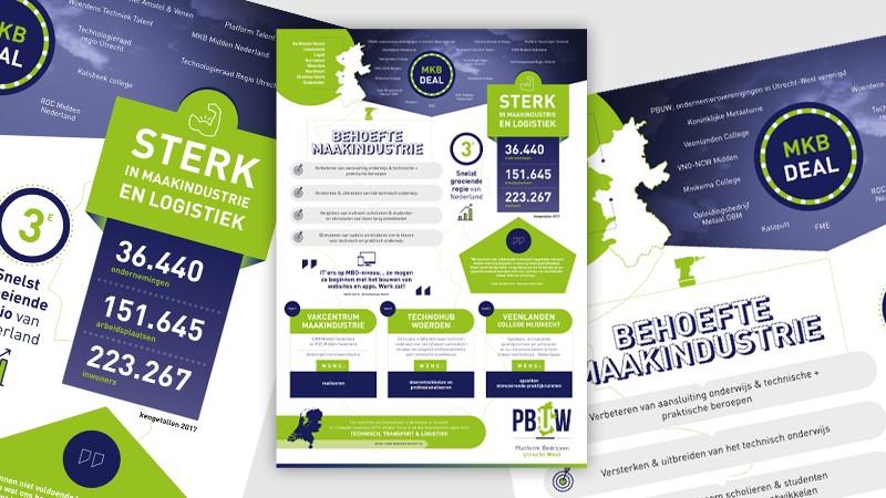 Naast diverse gemeenten heeft Team Switch ook werk geleverd voor PBUW; de samenwerking van ondernemersverenigingen in Utrecht-West. We bedachten, ontwierpen en maakten een infographic ter ondersteuning van PR en de aanvraag voor ‘de MKB-deal’ van de centrale overheid. Er is een tekort aan technisch personeel en daar moet wat mee worden gedaan. Door te beginnen met het onderwijs waarin steeds minder kinderen kiezen voor praktische opleidingen. Door middel van deze infographic laat de Provincie zien dat er veel meer te bieden is binnen de techniek-, transport- en logistieksector dan de doelgroep wellicht denkt. Diverse media hebben de infographic meegenomen in hun nieuwsberichten.